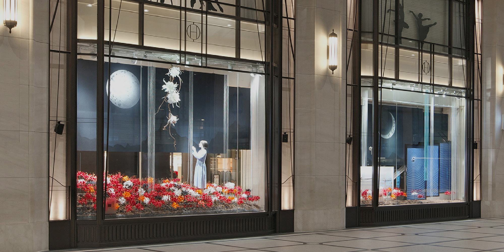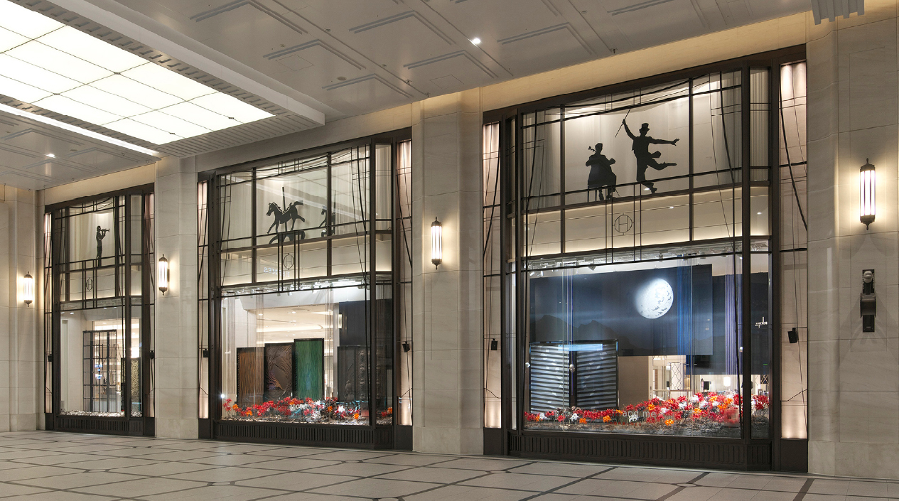 「職人社秀平組 一大絵巻」と題された6 面のウィンドーは、挾土氏がこのコンコースのために創造した、“日本の美”に着想を得た世界観です。はじまりを告げる粋な口上。心地よさと静けさ、ざわめきが交差する自然の情景。涼しげな波紋、流れる稜線、ゆらめく炎。移ろう月とともに叙情的に展開するこの物語は、さながら一つの演劇のようです。確かな技と想像性に基づき、一人ひとりの内に潜む“日本の美”に力強く訴えかける壮大なインスタレーションを実現しました。